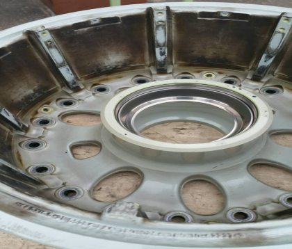 ![]() 需要翻新處理的飛機(jī)輪轂外形尺寸:Φ450-700*H140-400mm (看看,才幾天的飛行,飛機(jī)起降對(duì)輪胎、輪轂的沖擊有多大!) 噴砂后接受探傷檢測(cè)時(shí)的輪轂,讓損傷一覽無(wú)余!